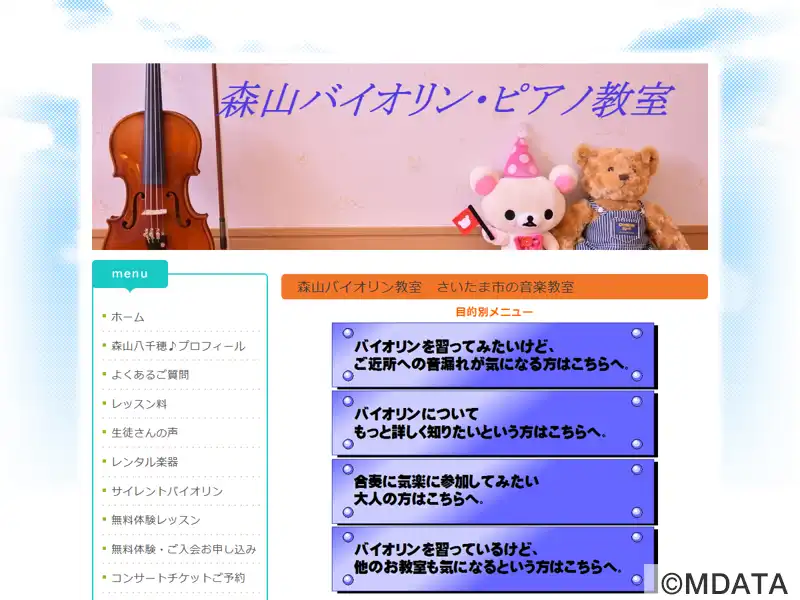 さいたま市見沼区にあるバイオリニスト森山八千穂氏(洗足学園大学音楽学部卒)が主宰するバイオリン教室。小さなお子さまからシニアの方まで、初心者から音楽学校を目指す方まで、レベルや進度に応じて分かりやすく丁寧な個人レッスンを提供。また、グランド型ハイブリットピアノを用いたピアノレッスンも開講している。分数楽器と練習用のサイレントバイオリンのレンタルを行なっている。