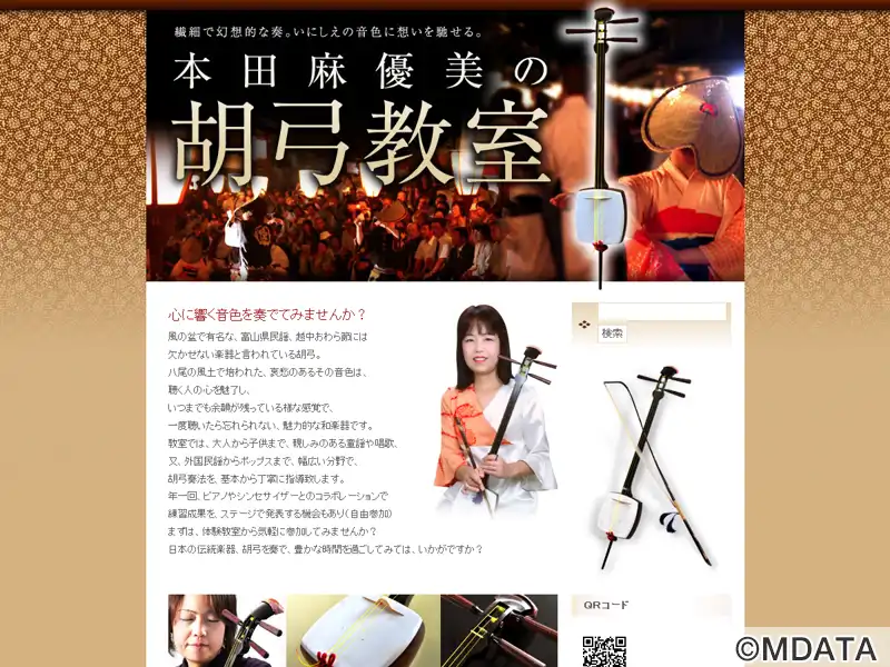 富山県民謡・越中おわら節に欠かせない楽器、胡弓を教える教室。民謡・胡弓奏者である本田麻優美氏(民謡民舞全国大会優勝者など)が指導を行う。大人から子供まで、童謡や唱歌、外国民謡からポップスなど、幅広いジャンルで胡弓の基本から丁寧に指導する。高岡市や富山市などの場所で、個人レッスン及びグループレッスンを行う。年に1度、ピアノやシンセサイザーとのコラボレーションで練習成果をステージで発表する機会もある。
