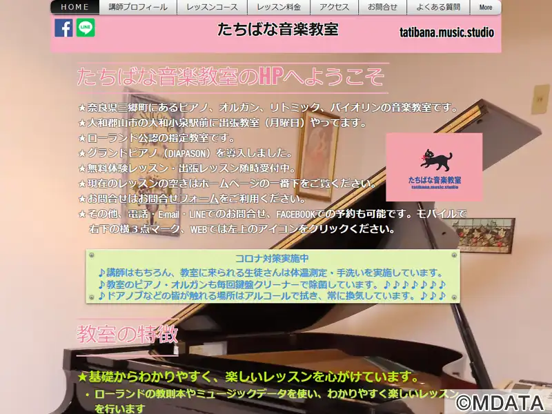三郷町にあるローランド公認音楽教室です。ピアノ、オルガン、リトミック、バイオリン科を開講。幼児からシニアの方まで、一人ひとりの個性やペースに合わせて基礎から丁寧に指導します。ローランドの教則本やミュージックデータを使用した分かりやすく楽しいレッスンです。リトミック科は様々な音楽体験を通して、音楽の基礎と豊かな感性を育む少人数グループレッスンです。無料体験レッスン随時受付中。