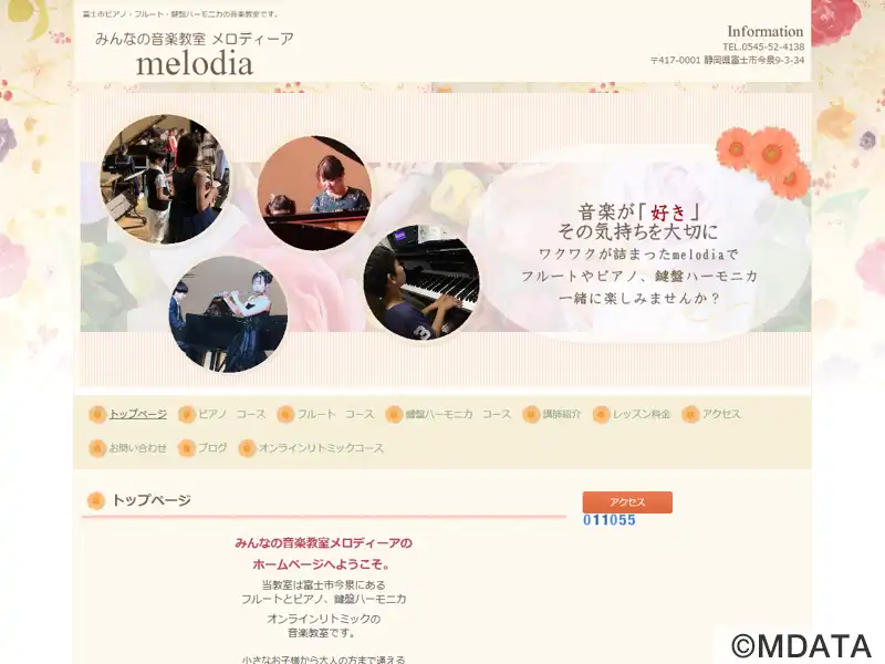 富士市今泉にあるフルートとピアノ、鍵盤ハーモニカの音楽教室。2010年にフルート・ピアノ教室melodiaとして設立し、22年11月より鍵盤ハーモニカコースの新設を機に、教室名を『みんなの音楽教室melodia』に改名。生徒の目標に合わせて楽しく学び、自己肯定感を育み、オリジナルレッスンノートで家での練習もサポート。子どもからシニアまで通えるアットホームな教室を目指してレッスンを提供している。