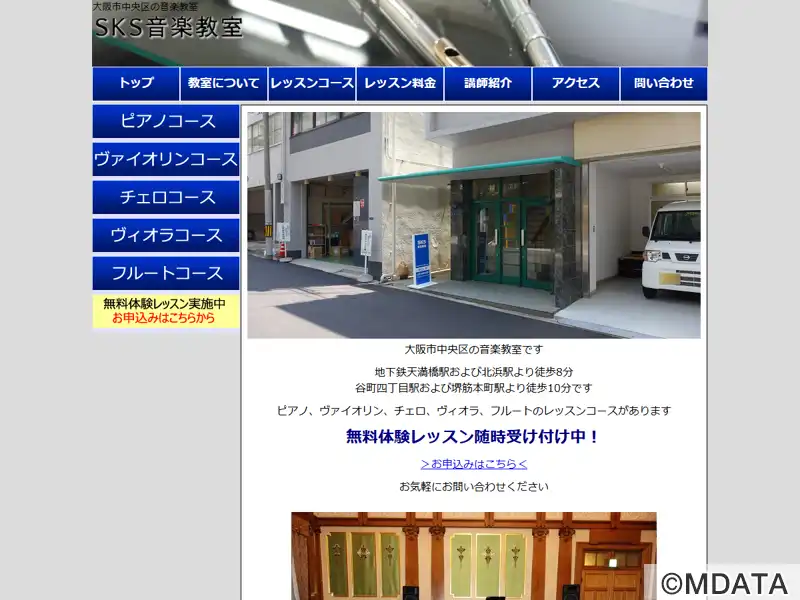 大阪市の地下鉄北浜・天満橋駅から徒歩圏内に位置する音楽教室。ピアノ、ヴァイオリン、チェロ、ヴィオラ、フルートのコースを提供し、小さな子供から大人まで、初心者から上級者まで幅広い生徒が楽しくレッスンを受けることができる。マンツーマンレッスン形式で、一人ひとりに合わせた教材選びと、響きの良い防音室での集中したレッスン環境を提供している。年に一度の発表会もあり、生徒たちの成果を披露する機会を設