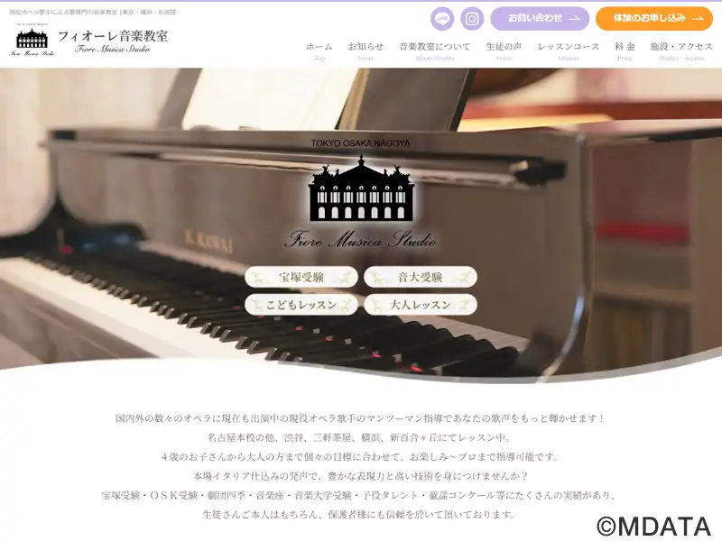 名古屋・覚王山にある、現役オペラ歌手が講師のうた専門の音楽教室。宝塚音楽学校に合格者を輩出し、初心者から音楽大学・OSK受験、宝塚受験、プロ養成まで、マンツーマンレッスンで指導している。子どもから大人まで多数の指導実績があり、毎年音楽大学合格者やコンクール入賞者を多数輩出。また、名古屋こども歌劇団を主宰している。教室は地下鉄東山線「覚王山駅」2番出口より徒歩5分、大通り沿いビル3F。
