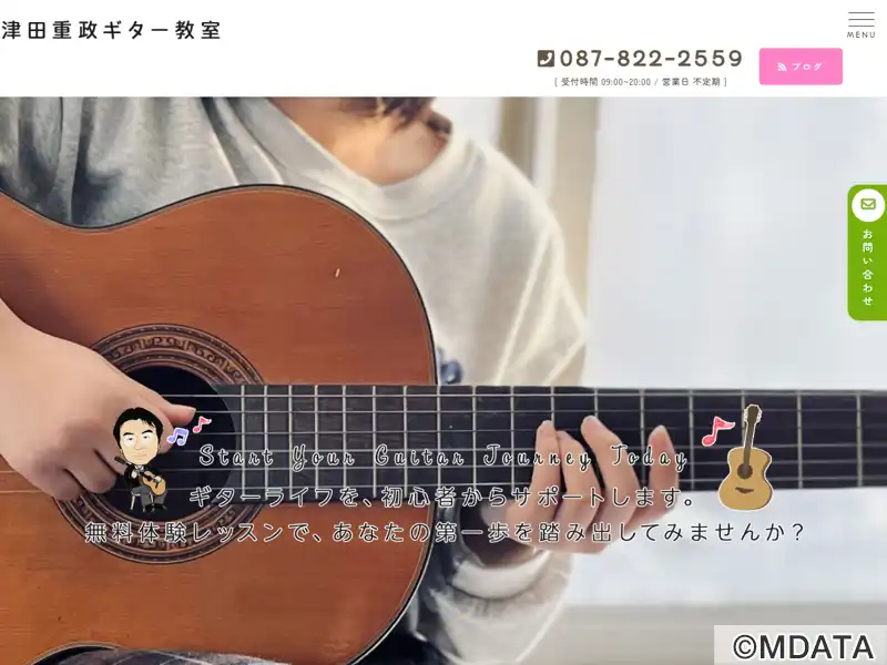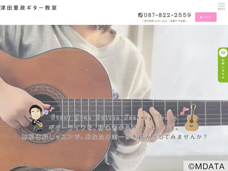 香川県高松市にある、津田重政氏が指導するギター教室。日本ギター・レスナーズ・クラブ(JGLC)の認定。プライベートレッスン方式で、初心者から上級者、小学生から年配者までの幅広い年齢層の生徒を対象に、ジャンルを問わず指導を行っている。希望に応じて、練習用のギターの提供や、初心者向けの3ヶ月無料レンタルギターのサービスもあり。レッスンは予約制で、都合に合わせてレッスンの日時を選択できる。無料の駐車場あり。