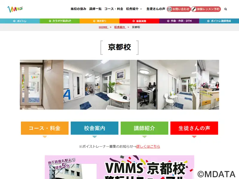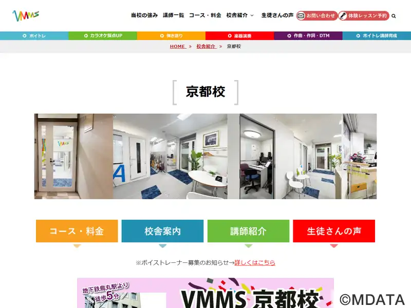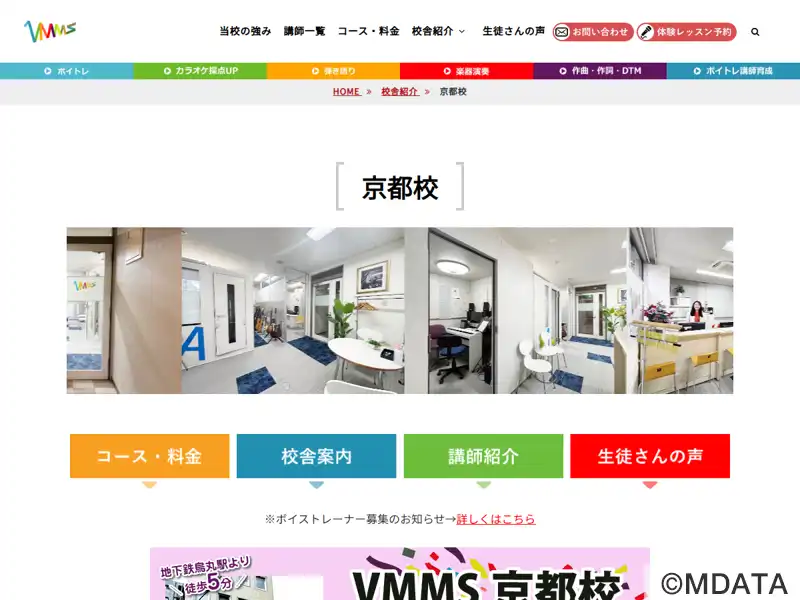 京都五条駅近くのボイストレーニング専門スクール。講師陣の丁寧な指導のもと、エレメンタリーコースからアクティブフリーコースまで、個々のレベルに合った様々なコースを提供し、歌唱技術を広範囲にわたり強化することができる。また、ギターやピアノの弾き語りなども学べ、音楽全般のスキルアップが可能。さらに、定期的に開催されるイベントで自身の実力を試したり、生徒同士の交流を通じてモチベーションを高める機会もある。