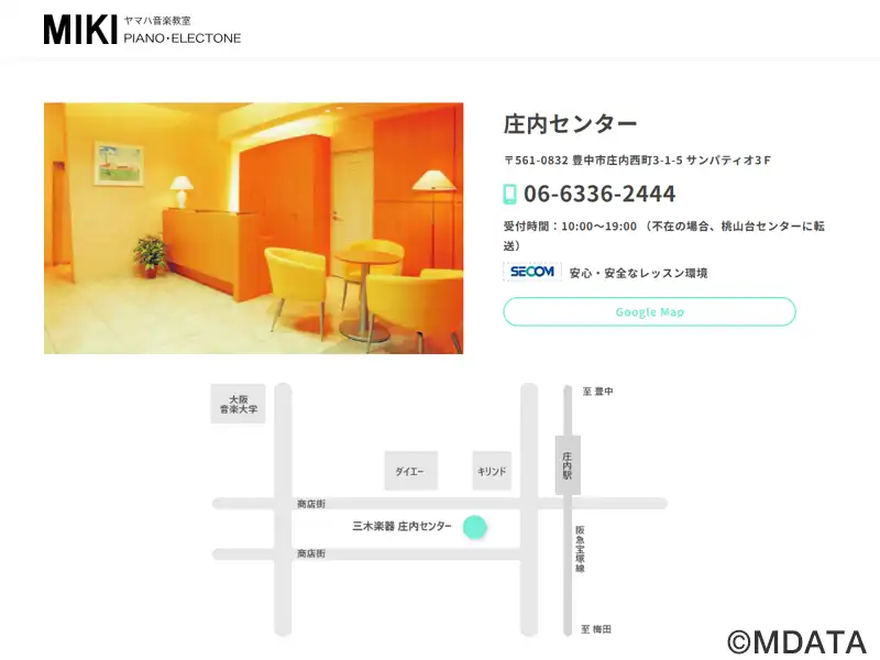 大阪豊中市の阪急庄内駅前サンパティオ3Fにある、現存する最古の楽器店といわれている1825年創業三木楽器のレッスンセンター。ヤマハ認定講師による共通テキストとカリキュラムで、音楽を通して子どもたちの心を育てる「ヤマハ音楽教室」、大人向けの「ヤマハミュージックレッスン」を開講。レッスンルームにはヤマハグランドピアノや最新機種のエレクトーンが導入されている。ピアノリサイタルも毎年開催している。