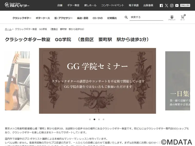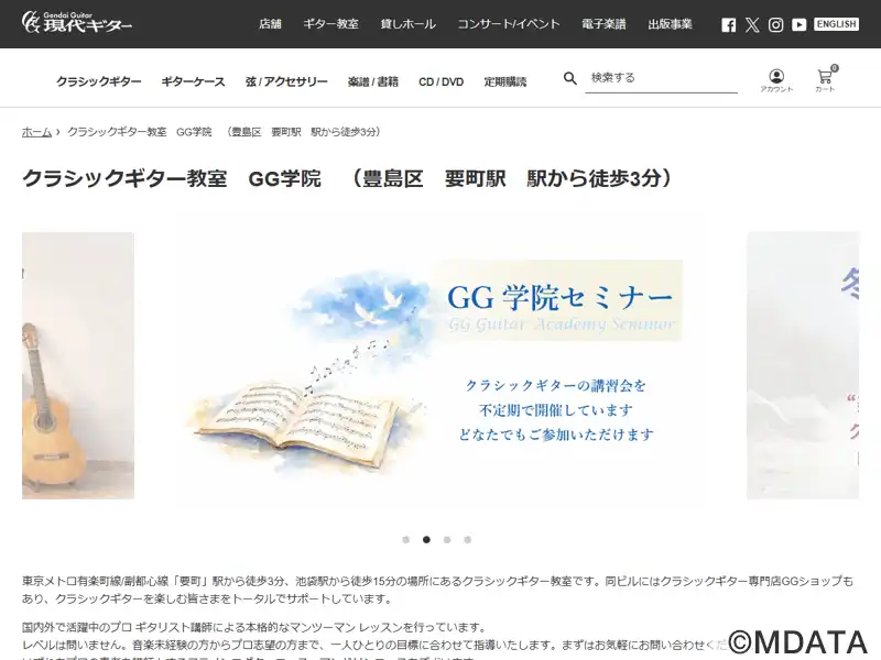 東京都豊島区に位置する、クラシックギターを中心にフラメンコギターやマンドリンのレッスンを提供するギター教室。国内外で活躍するプロギタリストが講師を務め、初心者からプロ志望者まで幅広いレベルに対応したマンツーマン指導を行う。楽器を持っていなくても教室の貸しギターを利用できる。アンサンブルを楽しむギターサークルも開催し、仲間と音楽を奏でる喜びも味わえる。ギターを通じて本格的な音楽の世界を体験できる。