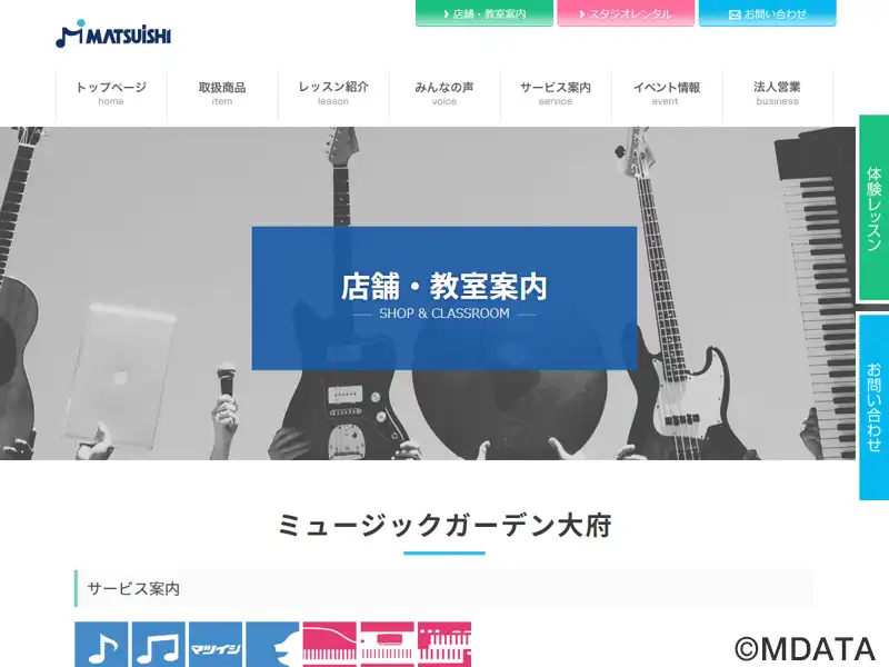 愛知県大府市に位置する、マツイシ楽器のレッスンセンター。知多半島で唯一のヤマハユニスタイル教室として、1歳から大人までを対象にした個人およびグループレッスンを提供。ギター、ウクレレ、エレキベース、チェロ、マリンバ、管楽器、インディアンフルート、リコーダーアンサンブル、津軽三味線など多様なレッスンが充実。子どもから大人までの総合的な音楽教育を提供する。楽器や、楽譜、アクセサリーの販売も行っている。