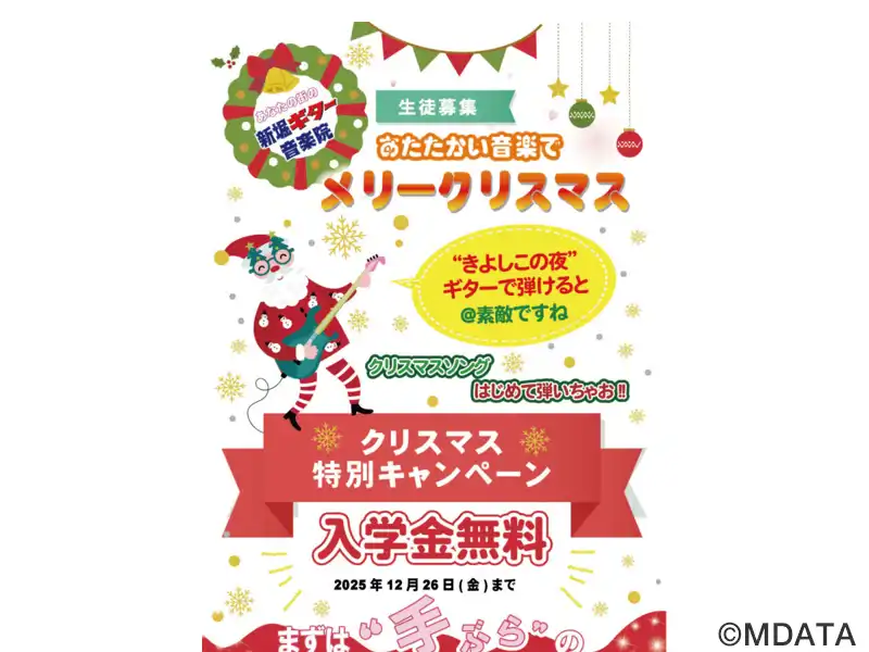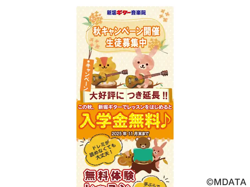 横浜市の上大岡駅西口から徒歩5分にある、新堀ギターの総合音楽教室。ギター、ピアノ、フルート、ドラムなど多様な楽器のレッスンを提供し、初心者から専門的に学びたい方まで幅広いレベルに対応する。個人レッスンからグループレッスンまで、生徒一人ひとりのニーズに合わせた指導で楽しく上達できる。また、広いサロンでのアンサンブルや、自由に利用できる練習スペースもあり、音楽仲間との交流も楽しめる。楽器レンタルも可能。