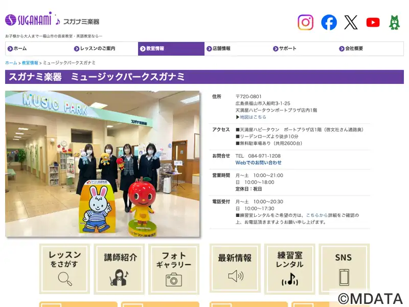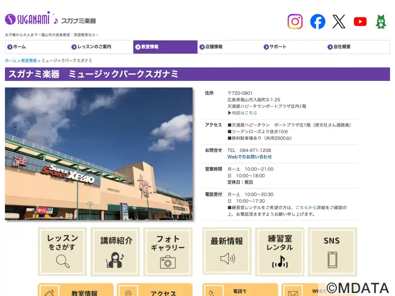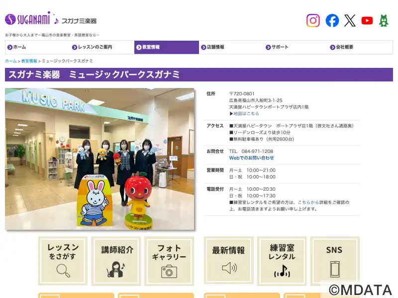 広島県福山市の天満屋ハピータウンポートプラザ1階にあるスガナミ楽器が運営するレッスンセンター。未就学児から大人まで幅広い世代を対象に、ピアノやエレクトーン、ギター、バイオリン、ドラム、サックス、ボイストレーニングなど多彩なレッスンを開講。初心者から経験者まで、それぞれのレベルや目的に応じた丁寧な指導が特徴で、個別指導に加えてグループレッスンやアンサンブル指導、発表会やコンクール対策も行なっている。