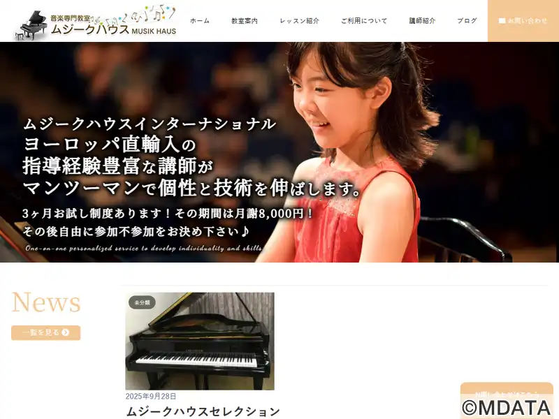 埼玉県日高市に位置する音楽専門教室ムジークハウスのレッスンセンター。ピアノやギター、作曲、声楽、ソルフェージュなどのレッスンを提供。自分らしい表現力を身につけられるよう丁寧な指導が特徴。ウィーンで研修を積んだ講師や全日本ピアノ指導者協会の正会員など、経験豊かな指導陣によるマンツーマンレッスンで、初心者から専門課程を目指す方まで幅広く対応。多くのコンクール受賞者や名門音楽大学進学者を輩出している。