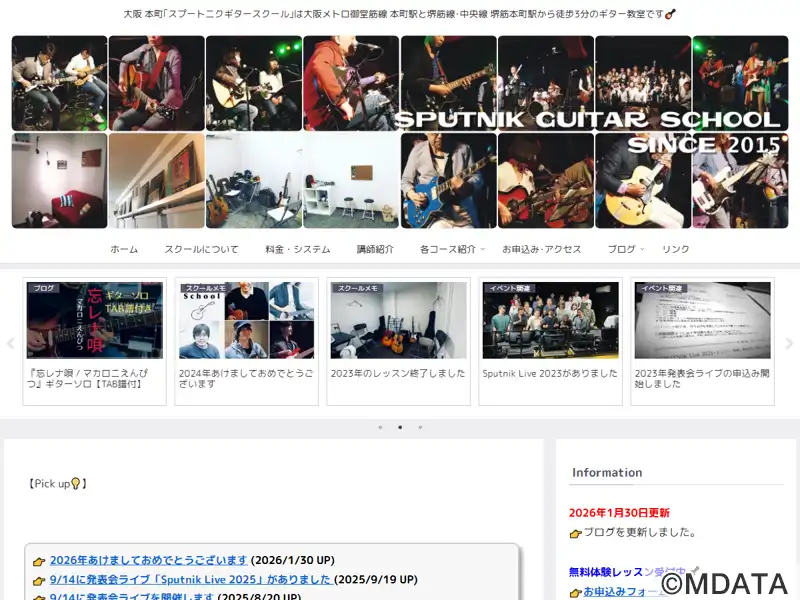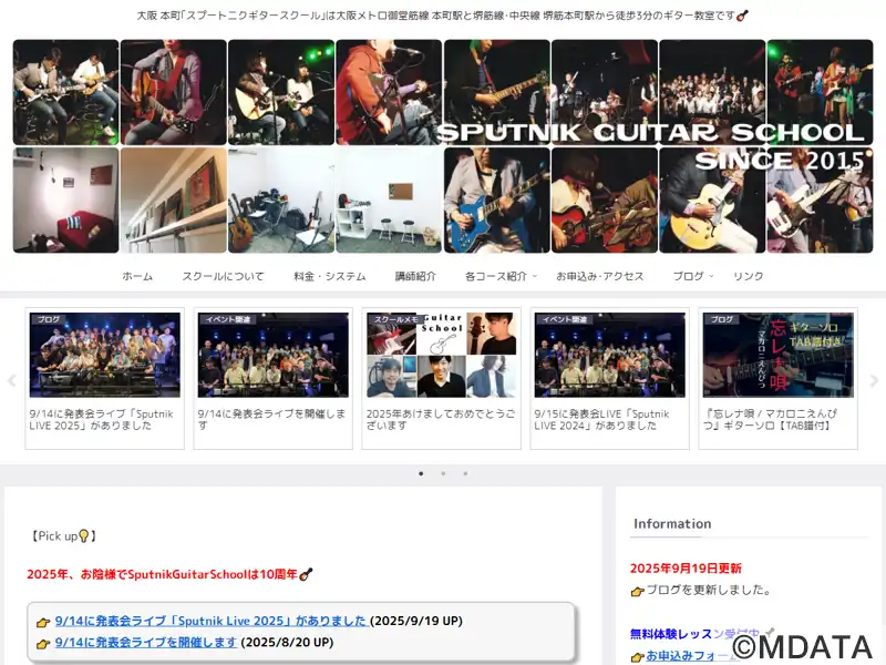 大阪市地下鉄本町駅や堺筋本町駅から徒歩3分のギター教室。初心者から上級者まで、ロック、ジャズ、フュージョン、ブルース、ファンク、ポップスのエレキギターやアコースティックギターのレッスンを提供。講師陣は豊富な指導経験を持ち、「楽しみながら上達出来る」をモットーに親しみやすい指導を行う。発表会やセッション会、親睦会などのイベントも開催。楽器の購入サポートや、オリジナル曲の制作サポートなども行なっている。