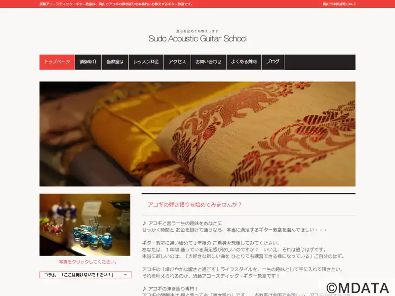 岡山市で本格的なアコースティックギターの弾き語りを指導するギター教室。生徒の長所やセンスを引き出し、ギター演奏と歌唱力をバランス良く向上させることを目指す。ギターの奏法の基本から高度なテクニックまで、オリジナルの教則本を用いて体系的に学ぶ。歌唱指導では、呼吸法、発声法、リズム感、音感、声質の改善に重点を置く。教室はモダンアジアンスタイルで統一された広い空間で、レッスンに集中できる環境が備わっている。
