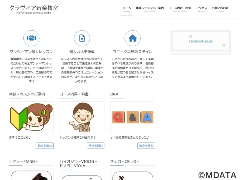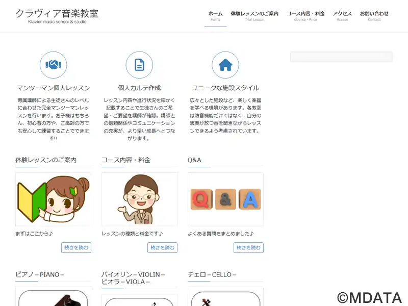 愛知県一宮市にあるアットホームな音楽教室。子どもから高齢者まで幅広い世代に対応し、完全マンツーマンレッスンを提供している。ピアノ、ヴァイオリン、ヴィオラ、チェロ、サックス、フルート、ギター、声楽など多彩なコースを用意し、生徒一人ひとりに合わせた個別カルテを作成。白を基調とした明るいレッスン室4部屋を用途。講師との信頼関係を大切にした丁寧な指導で、個々の個性を引き出し、音楽を奏でる喜びを実感できる。