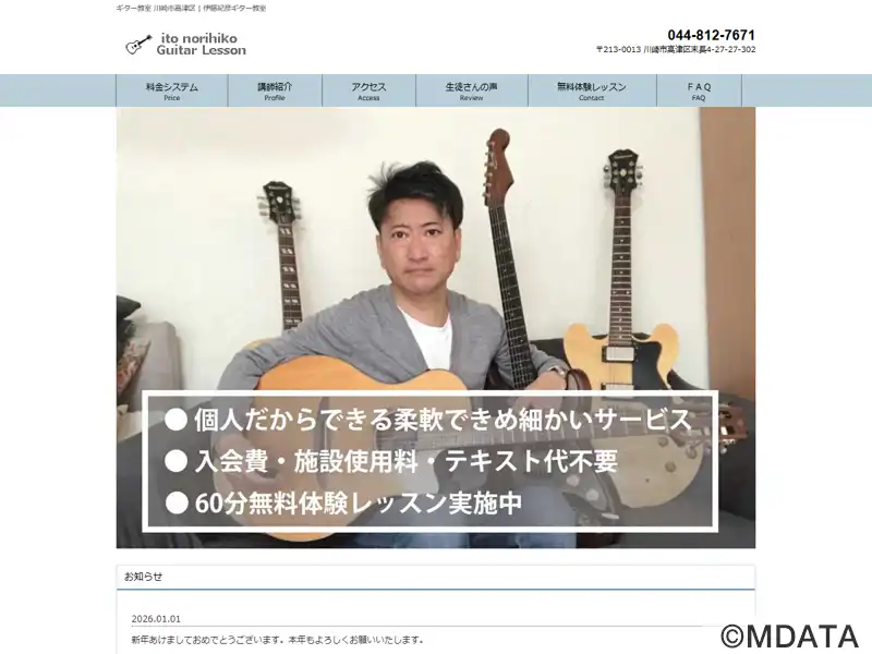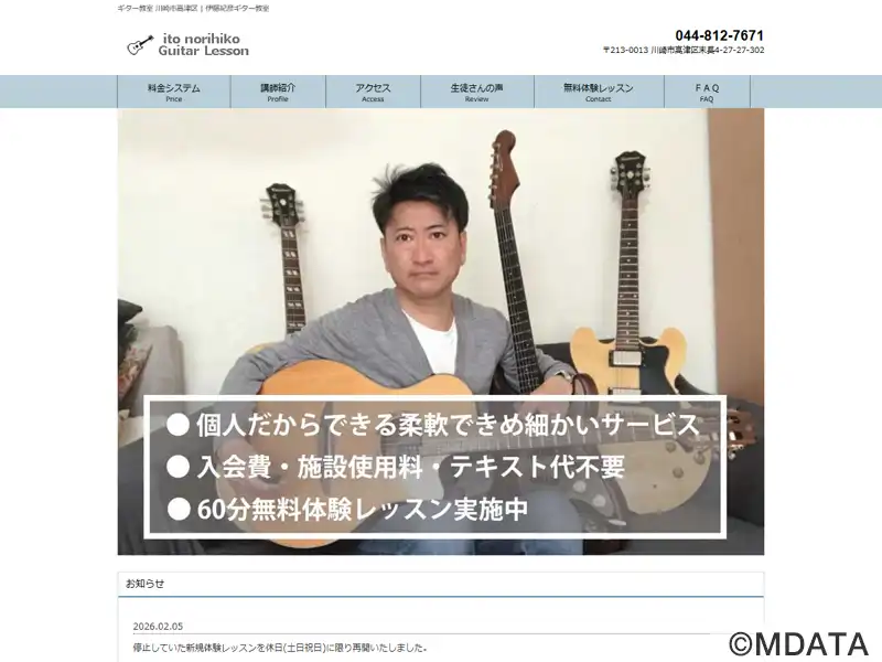 川崎市武蔵新城駅から徒歩9分の場所にあるギター教室。一人ひとりの目標や希望に合わせたマンツーマンレッスンを提供し、初心者から上級者まで幅広く対応する。初心者には簡単にアレンジされた曲を使って基礎を教え、上級者にはジャズ、アドリブ、音楽理論などの専門的なレッスンを行う。譜面のアレンジや耳コピでの譜面化など、生徒の興味に合わせた教材も用意。また、作曲、音楽理論、DTMレッスンなど、幅広いニーズに応える。