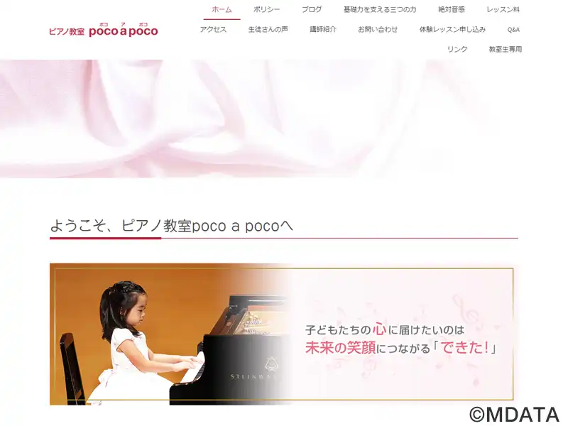 仙台市太白区にあるピアノ教室。音楽の基礎力として、読譜力、音感、テクニックの3つを重視し、生徒一人ひとりのペースに合わせた無理のないレッスンを行う。特に6歳半までの子どもを対象に、絶対音感を養う指導を提供し、音楽理解の基盤を築く。未就学児向けプレピアノ、個人レッスンとソルフェージュ・楽典のグループレッスンを組み合わせた指導も実施。大人の受講も歓迎し、幅広い年齢層に対応。音楽を通じて個性を大切に育む。