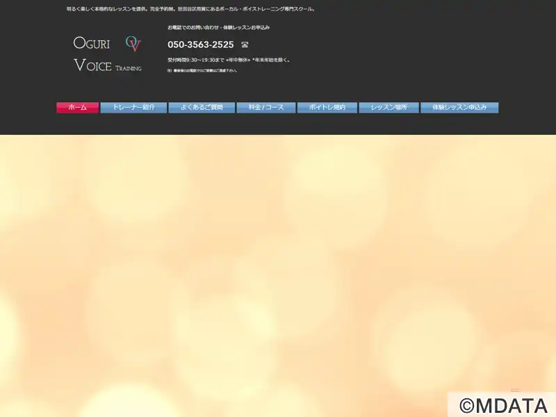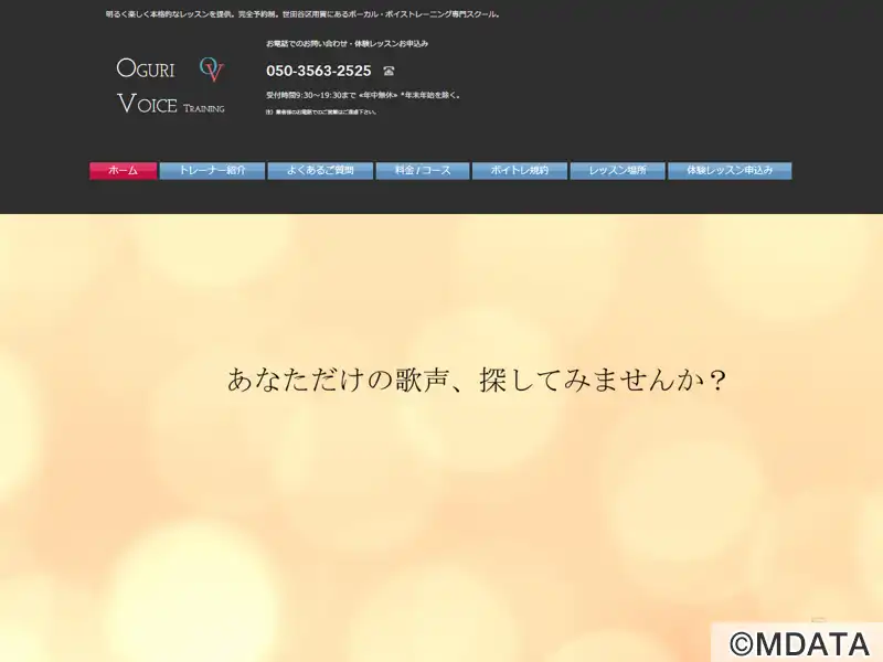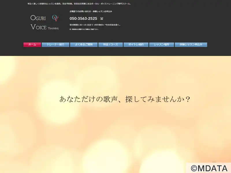 東京・世田谷区にあるボイストレーニング専門教室。講師には、国内外で活躍するプロのトレーナーが在籍している。徹底した基礎を固めるレッスンプランで、長期的に安定した発声法が身につくことを目指す。初心者からプロを目指す歌手まで幅広い層の生徒が受講している。明るく楽しいレッスンを通じて「正しい発声の軸」を身につけることができる。完全予約制で、いつでもレッスンが受けられ、オンラインレッスンにも対応している。