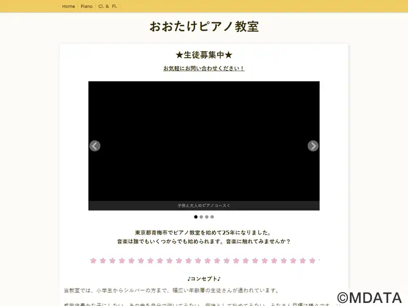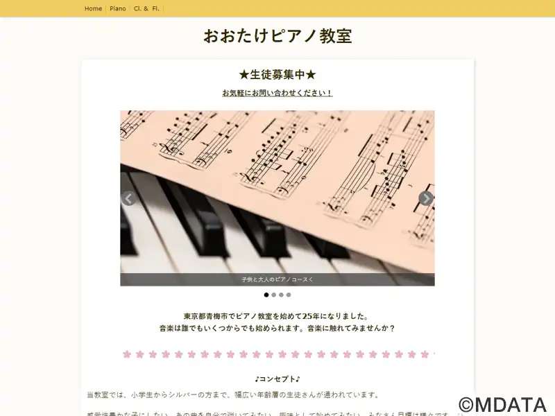 東京都青梅市わかくさ公園近くの音楽教室。25年以上の指導実績を持ち、子供から大人まで幅広い年齢層を対象にしたピアノ個人レッスンに加え、クラリネット、フルートのコースを開講している。ピアノレッスンでは、譜読みや表現力の基礎を大切にしつつ、生徒一人ひとりのペースに合わせた指導を行なっている。また、発表会や合唱団の活動を通して、アンサンブルの楽しさを体験し、音楽を通じた成長や交流の機会も提供している。