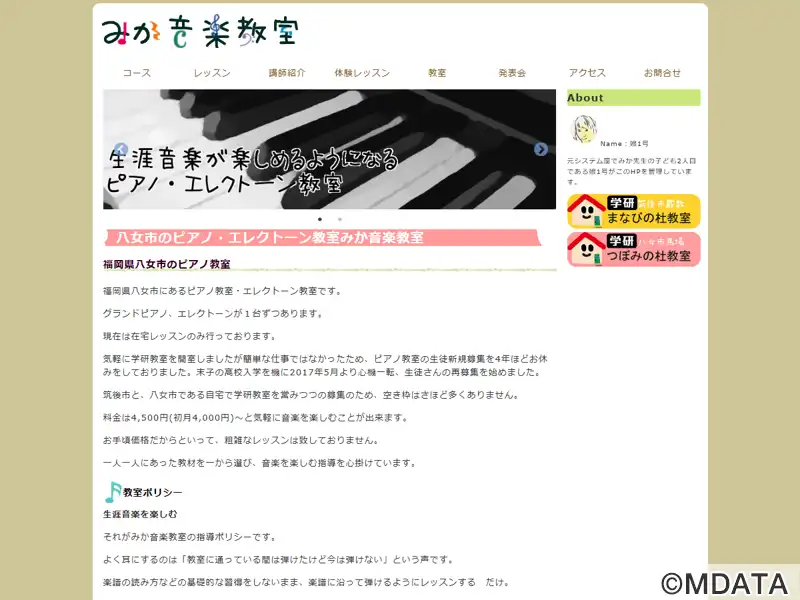 福岡県八女市にあるピアノ・エレクトーン教室。「生涯音楽を楽しむ」を理念に、一人ひとりの個性や目標に合わせた指導を行う。基礎的な楽譜の読み方やテクニックを重視し、卒業後も趣味として音楽を続けられる力を育む。脳科学的アプローチを取り入れ、両手の異なる動きを通して人間性知能(HQ)の向上を目指す。グランドピアノとエレクトーン各1台を用いた在宅レッスンで、丁寧な個別指導を実施。学研教室も併設している。