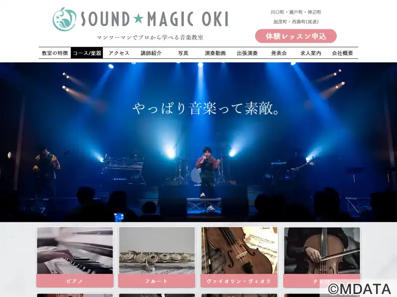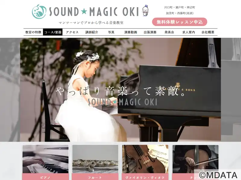 広島県福山市川口町を拠点に瀬戸町・神辺町などに複数のレッスンセンターをもつ音楽教室。ピアノ、バイオリン、フルート、サクソフォン、コントラバス、ギター、ドラム、ボーカル、作曲・DTMなど多彩なコースを提供。プロミュージシャンや音楽大学卒の講師によるマンツーマン指導で、3歳から70代まで、初心者から音大受験やプロを目指す人まで幅広く対応。発表会や季節ごとのイベントを通じて生徒同士の交流も充実している。
