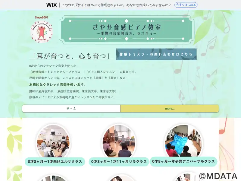 神奈川県横浜市で2002年に開講したリトミック・ピアノ教室。「耳が育つと、心も育つ」を理念に掲げ、0歳から本格的な音楽教育を行う。リトミックや絶対音感の少人数グループ指導、クラシックを中心としたピアノ個人レッスンを実施。音大卒の講師が英国王立音楽院や東京芸大で培った専門知識を生かし、独自メソッドで基礎力と表現力を養う。絶対音感リトミッククラスでは、楽しく学びながら自然にピアノレッスンへと進める。