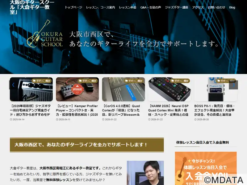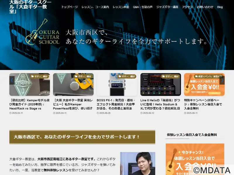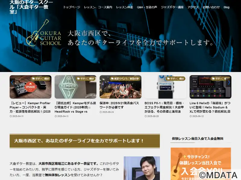 大阪市西区に位置するギタースクール。音楽大学を卒業し、プロミュージシャンとしても活動する経験豊富な講師が、初心者から上級者までを対象に、個別カリキュラムに基づいたレッスンを提供。ジャズ、初心者、エレキ・アコースティックの各コースを開講し、教室独自の教材を使用して、基礎技術の指導にも力を入れている。また、教室発表会やセッション、ワークショップを定期的に開催し、練習の成果を発表する機会も提供している。