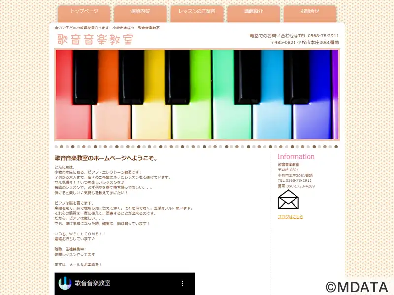 小牧市本庄にあるピアノ・エレクトーン教室。幼児向けには、遊び感覚で指のトレーニングから、フラッシュカードやリズムカードを使って基本的な音楽知識を学ぶ。小学高学年以上には、様々な時代・ジャンルの曲を題材に、本格的な演奏技術の向上を目指す。大人向けには、ライフスタイルと希望に合わせて柔軟なレッスンを行う。ミュージックプログラミングでは、MIDI検定4級取得も可能。音楽の楽しさを伝えることを大切にする。