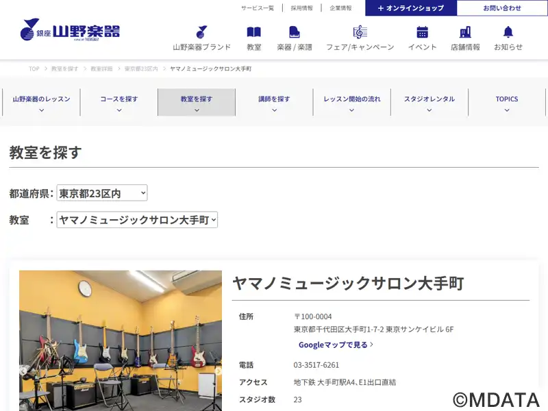東京都代田区の大手町駅A4・E1出口に直結する、東京サンケイビル メトロスクエア6階に、2019年オープンした山野楽器のレッスンセンター。23部屋のレッスンルームを備え、快適で広々としたラウンジやイベントスペースも完備。大人向けのヤマハミュージックスクールを中心に、ピアノ、ギター、ドラム、フルート、バイオリンなど50種類以上のコースを提供。初心者から経験者まで対応する多様なレッスンが用意している。