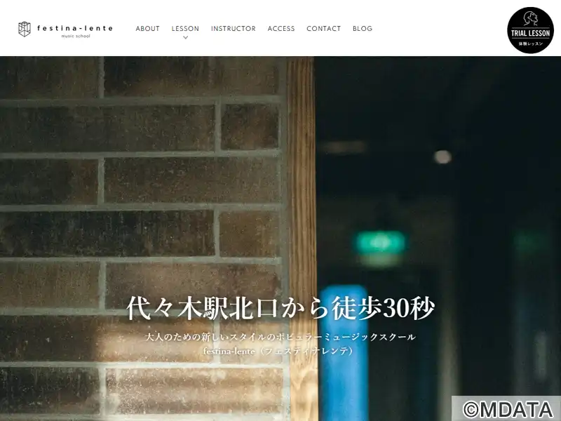 東京渋谷区の代々木駅北口近くに位置する、大人のためのミュージックスクール。ラテン語で「急がば回れ」を意味する理念を掲げ、音楽を楽しむ力を身につけることを目的としている。レッスンはプロ講師によるマンツーマン形式で、未経験者向けのエントリークラスから、目標に合わせたレギュラークラス、オンラインクラスまで用意。ヴォーカルやピアノ、ギター、サックス、フルートなど多彩なコースに対応し、幅広いジャンルを扱う。