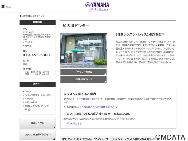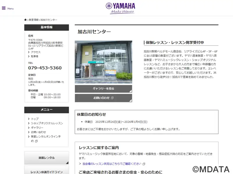 兵庫県加古川駅前に2020年に開校したヤマハ音楽教室。全15室の防音レッスンルームを備え、幼児から大人までを対象に、ピアノ、エレクトーン、バイオリン、LM楽器など多彩なコースを展開。子ども向けには、聴く・歌う・弾く・楽譜を読む、をバランスよく学べるカリキュラムを用意し、成長段階に合わせた丁寧な指導を行う。大人向けには、個人レッスンを中心に、初心者から経験者まで楽しみながら上達できるレッスンを提供。