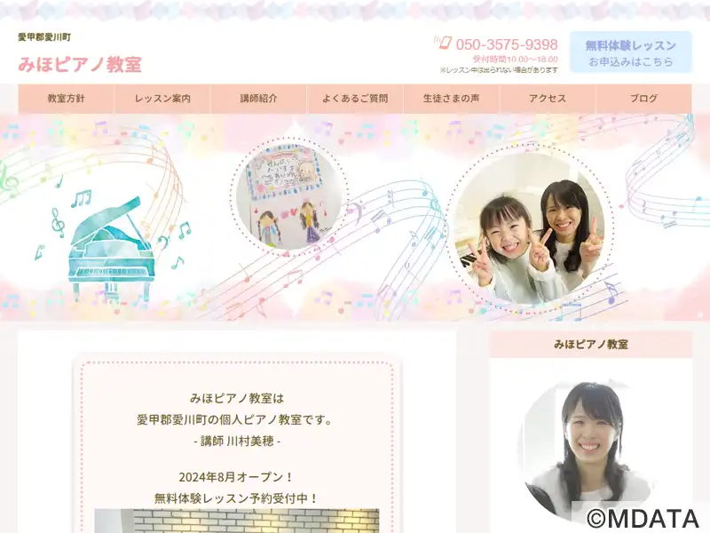 神奈川県愛川町にて、2024年8月に開校した個人ピアノ教室。幼児から小学生を中心に、生徒一人ひとりに合わせたオーダーメイドのレッスンを提供。「褒めて伸ばす」をモットーに、生徒の自己肯定感を高める指導でピアノを楽しく続けられるサポートを行う。音楽理論やソルフェージュ、リズム練習や読譜力の向上も目指す。興味を引き出す、アニメやゲーム音楽を取り入れたレッスンもあり。練習の成果を披露する発表会も開催する。