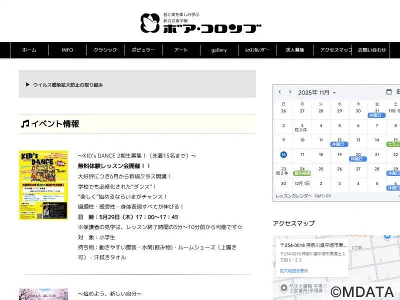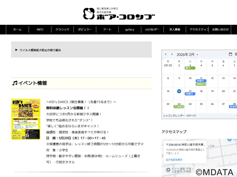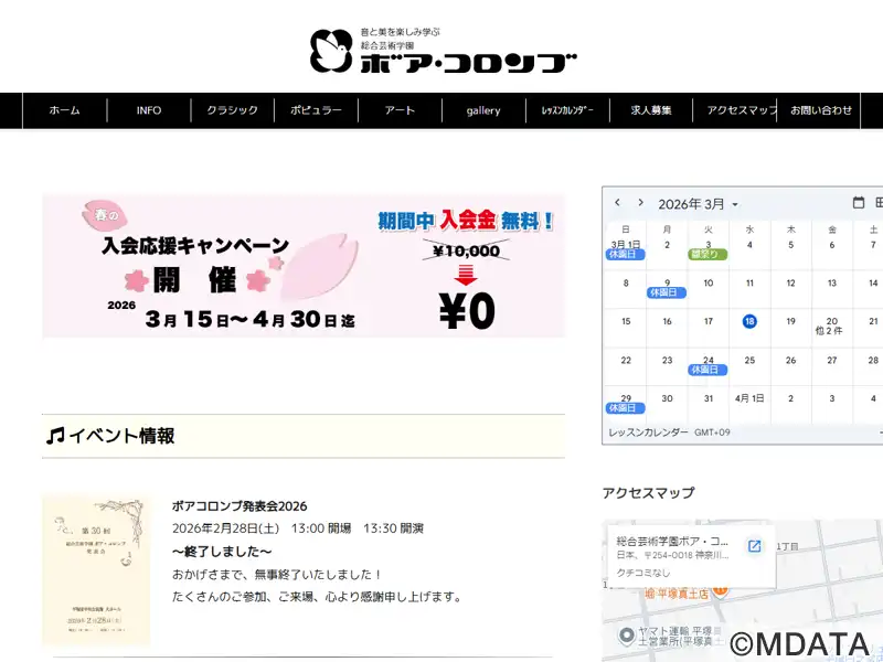 神奈川県平塚市にある音楽と芸術のスクール。ピアノ、バイオリン、フルートなどのクラシック楽器から、ボーカル、ベース、ギターなどのポピュラーミュージックまで、個人レッスンやグループレッスン、演奏家を迎えたホールレッスンなど、幅広いカリキュラムを用意している。クラシックバレエや書道・ペン習字などの科目もあり。練習の成果を発表するリサイタルや定期演奏会なども行い、技術とセンスを高めるための環境を提供する。
