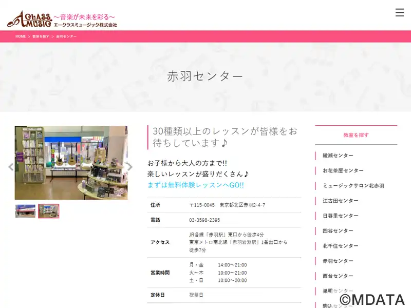 北区赤羽スズラン通りに1972年開業した音楽教室・楽器店。ピアノや電子ピアノ、エレクトーン、クラビノーバなどを展示し、いつでも試弾可能。調律や修理、楽譜やメンテナンス用商品、アクセサリ類も販売。音楽教室では、ヤマハ音楽教室、大人向けの音楽レッスン、歌・演技・ダンスの基礎を学び、歌唱力やリズムを身につける小学生対象のミュージカルコース、音大受験・コンクール・グレード取得対策など幅広いコースを開講している。