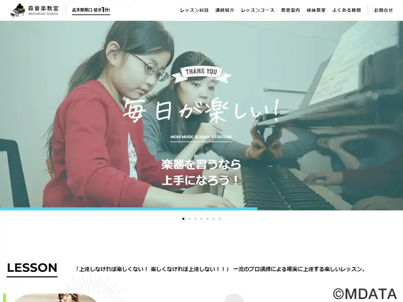 埼玉県新座市の志木駅前にある音楽教室。ピアノ、ヴァイオリン、チェロ、フルート、ギター、ジャズピアノなど幅広いコースを提供し、子供からシニア、初心者から音大受験生まで対応。プロ講師が、個々の目標に合わせたマンツーマンレッスンを行う。発表会やコンサートを通じて、演奏経験を積み、音楽を楽しむ心を育む。プロ志向向けのディプロマコースもあり。初心者も安心して始められ、音楽を一生の趣味や目標にできる環境が整う。