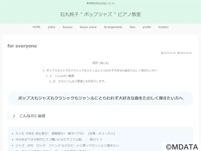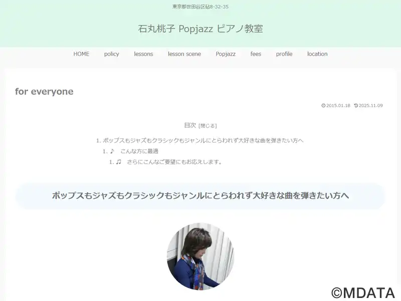 世田谷区成城にある、Copainmusic代表の石丸桃子が主宰するジャズ、ポピュラーピアノ教室。コード奏法やジャズ理論、アレンジ手法をマスターしながら、感性を高め、読譜力や応用力、演奏技術を磨いていき、大人も子どもも、のびのびと自由自在にピアノを弾けるようにレッスンを行っている。2022年4月には成城教室の同場所に、レンタル専用の音楽サロン&レッスンルーム「マミューズ成城」を開設。