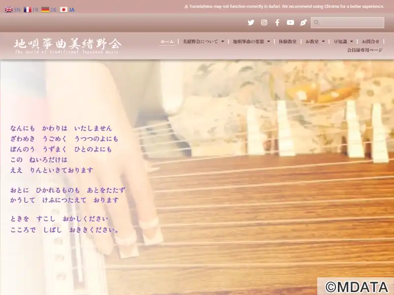 港区高輪教室(JR品川駅そば)を本部とする琴・三味線教室です。美緒野会では、初めてお箏や三味線にふれる初心者の方からプロの方まで、お子様からご年配の方まで、それぞれの方のペースに合わせて、マンツーマンで丁寧に楽しくご指導しております。お稽古は予約制。楽器・道具はすべて教室にて貸出し可能。スカイプレッスン対応可。無料体験教室あり。初めてお箏・三味線にふれる方向けの和楽器ワークショップも企画。