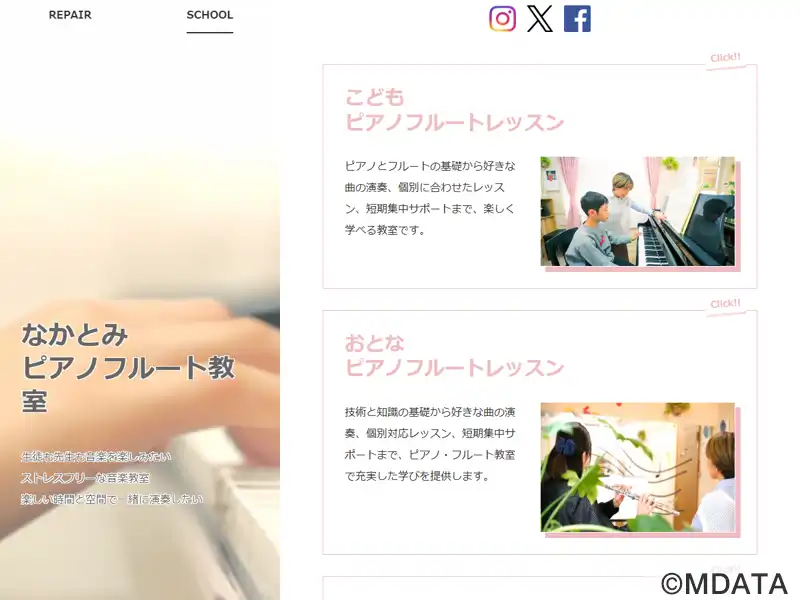 埼玉県所沢市にあるピアノとフルートの音楽教室。1歳半から大人まで、幅広い世代が音楽を楽しみながら学べるアットホームな環境が整う。生徒一人ひとりのレベルや目標に合わせたピアノ個人レッスンや、フルート・リコーダーのアンサンブルコースを用意。初心者から経験者まで、好きなジャンルや曲を選べるカスタマイズレッスンや、ピアノ伴奏や部活動サポートのための短期集中レッスンにも対応。音楽を楽しむ気持ちを大切にする。