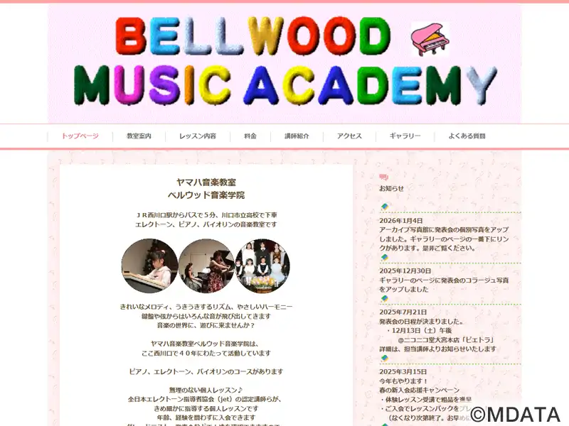 埼玉県西川口で40年以上の歴史を持つ音楽教室。ヤマハ音楽教室として、初心者から経験者までを対象としてピアノ、エレクトーン、バイオリンの個人レッスンを提供している。全日本エレクトーン指導者協会(jet)認定の講師が、年齢や経験に関わらず生徒一人ひとりに合わせた指導を行っている。音楽を楽しむことを重視した教育方針が特徴で、グレードテストや発表会を通じて上達を確認できる。大人向けのレッスンも充実している。