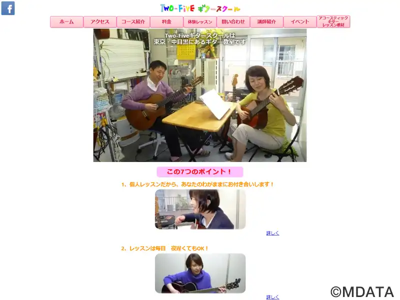 目黒区の中目黒駅近くにあるギターの個人レッスン教室。アコースティックギター、エレキギター、ウクレレのコースを開講。ジャズ、ロック、クラシック、ボサノバ、フォーク、ソロギターなど、多様なジャンルの演奏を学ぶことができる。初めて楽器に触れる方や、譜面が読めない方から、上級者まで、一人ひとりの好みやスキルに合わせた指導を行なっている。スクール独自の教材を使用し、短期間でアドリブなどの技術をマスターできる。