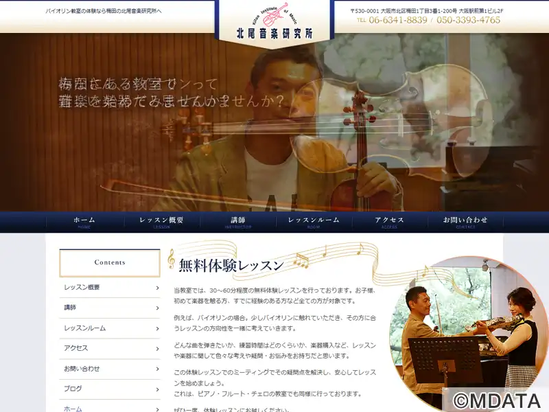 大阪梅田に1988年開校した音楽教室。バイオリンを中心に、美しい響きのグランドピアノを備えたレッスンルームでピアノ、フルート、チェロのレッスンを提供している。アメリカで習得した技術に基づく独自のメソードを採用し、柔軟性を重視した指導を行っていて、生徒の意志を尊重している。初心者から上級者まで対応。個人レッスンを基本に、グループレッスンや室内楽のレッスンも実施している。スケジュールは柔軟に調整できる。