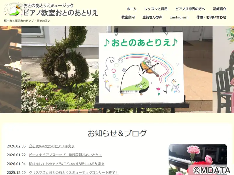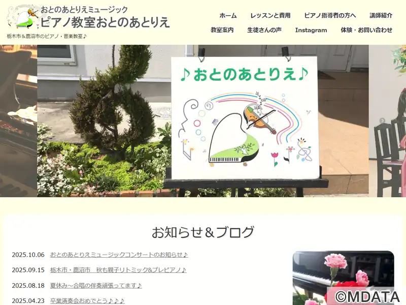 栃木市・鹿沼市にあるピアノとリトミックの音楽教室。初心者から大人まで幅広い世代が楽しめる、一人ひとりに合わせたオーダーメイドのレッスンが特徴。幼児向けのリトミックコースをはじめ、クラシックからポピュラーまで様々な曲に挑戦できる大人向けのコース、さらには音大受験を目指すコースなども用意している。また、親子やグループでのリトミックレッスンも開講。発表会やコンクールなど、練習の成果を披露する機会もあり。