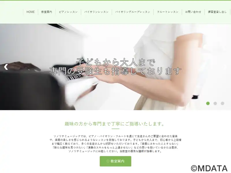 品川区の大井町と大崎でレッスンを行うピアノ・バイオリン・フルート教室。子供から大人まで、初心者から専門まで丁寧に指導。幅広い年齢層を対象に、初心者から上級者まで、趣味として楽しみたい方、演奏スキルを向上させたい方、音大受験対策など、一人ひとりに合わせた指導を行う。また、クラシックに限定せずに、好きな曲でレッスンできる。楽しい学びのためのオリジナル教材を使用。コンサート形式の発表会も毎年開催している。