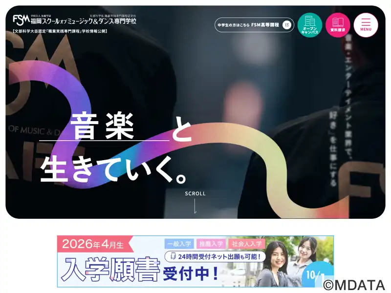 FSMは1999年に福岡スクールオブミュージック専門学校として創立。2014年より音楽・ダンス・エンターテイメントの専修学校として校名変更。プロミュージシャン科、音楽プロデュース科(3年制/音楽クリエーター、NY留学)、スーパーeエンターテイメント科(4年制)、商業音楽科、ダンス&アクターズ科、16の専門分野に32のコースを設置。