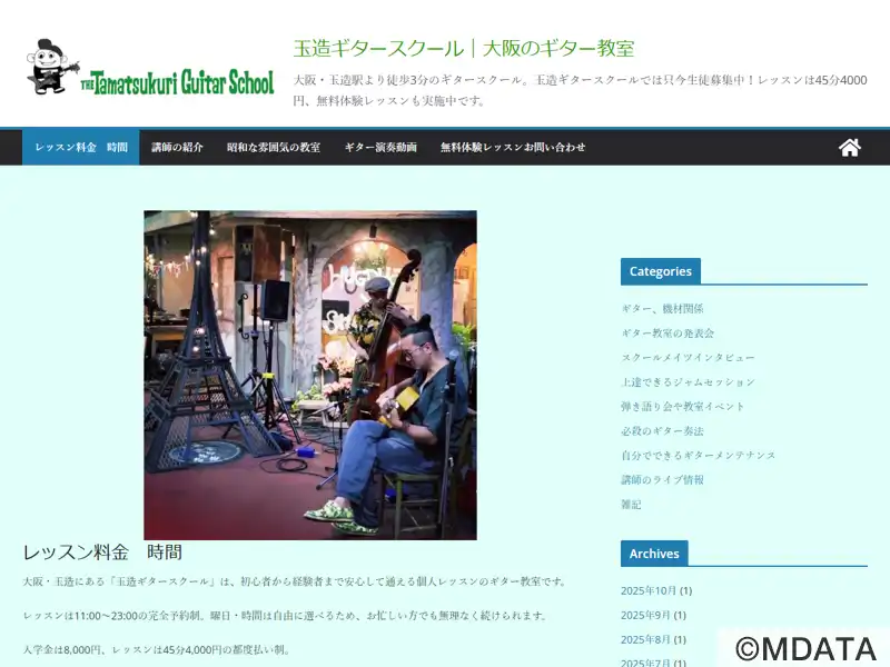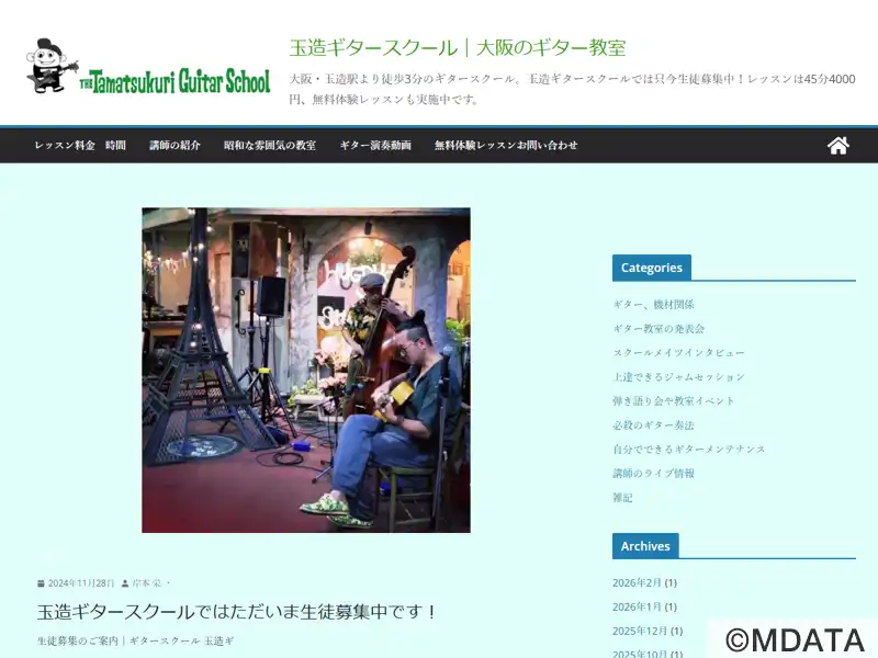 大阪市中央区・玉造エリアにあるアットホームなギター専門教室。ジュニアからシニアまで、レトロな雰囲気の中で、アコースティックギター、ガットギター、エレキギター、エレキベースを学べる。ジャズ、ロック、ブルース、弾き語りなど多彩なジャンルに対応。経験豊富な講師が一人ひとりのペースに合わせて指導を行い、個別レッスン、グループレッスン、セッション練習、ライブの機会も提供。不定期で小規模なライブイベント開催。