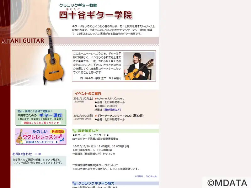 1978年に開設された富山市のクラシックギター教室。北欧風のレッスンルームで、初心者から上級者まで、生徒一人ひとりのレベルに合わせたマンツーマン指導を提供している。レッスンは月3回を基本に、忙しい方のために柔軟なスケジュール調整が可能。また、午後10時までレッスンが可能で、自宅での練習が難しいは教室で練習できる。ギターの魅力を伝え、心を癒す楽器としての楽しみ方も提案。中高年向けの合奏レッスンも開講。