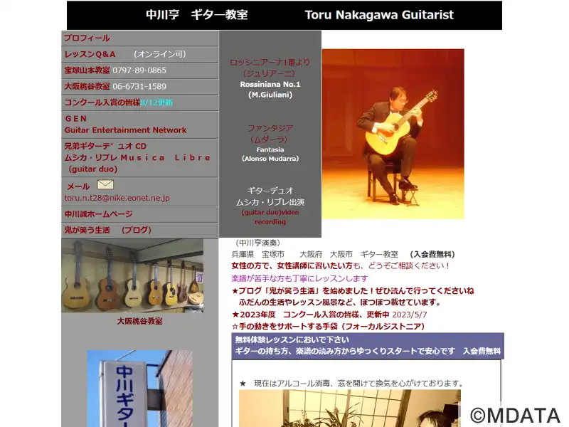 兵庫県宝塚市にあるギター教室。クラシックギターを中心に、エレキ・アコースティックなど幅広いジャンルに対応する。ギター奏者の中川亨氏が指導する。初心者の方、楽譜が苦手でも問題なく、小学生から80歳の方まで対象にする。個人レッスンでマイペースに進め、無理なく好きな曲にチャレンジできる。レベルアップを目指す方には、本格的なレッスンや音大受験コースが開講されている。毎年多くの生徒がコンクールに出場している。
