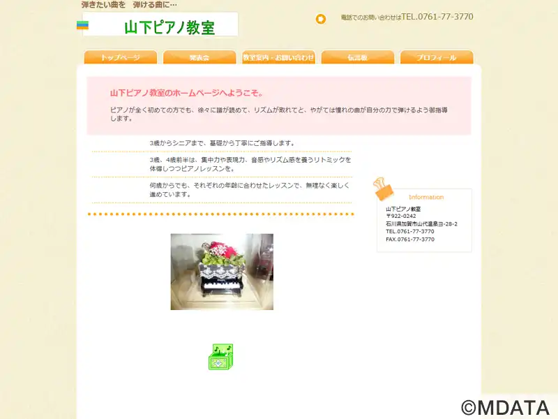 石川県加賀市のピアノ教室。3歳児からシニアまで幅広い年齢層に対応。「弾きたい曲を弾ける曲に」をモットーに、個人レッスンを通じて無理なく楽しく上達を目指す。幼児向けにはリトミックを取り入れ、音感やリズム感、集中力を養いながらピアノの基礎を学ぶ。大人向けコースでは、好きな曲を楽しんで弾けるよう基礎から丁寧に指導。アットホームな雰囲気の教室で、年2回の子供向け発表会や、年1回の大人向け発表会も開催している。