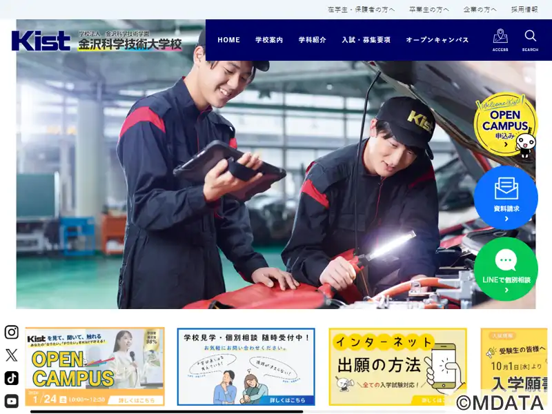 北陸地方で唯一の総合工業系専門学校として昭和62年創立。多くの卒業生が、北陸を中心とした産業界で技術者として活躍している。映像音響学科は、最先端の実習機器を使用した実践的なカリキュラムを採用。学生企画による対外的イベントを開催し、音響・照明・映像のシステムを実施で学ぶ。授業内容はソフトとハードのバランスが取れたもので、機器の操作から業界で必要とされる総合的なプロデュース能力まで、即戦力を身につける。