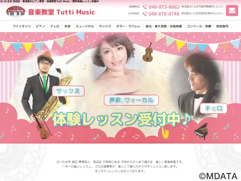 さいたま市の緑区東浦和と見沼区大和田でレッスンを行う音楽教室。3歳からシニアまでが、ピアノ、ヴァイオリン、チェロ、フルート、サックス、声楽、ミュージカル、ギター・ウクレレなど多彩なコースで学ぶ。プロ講師による個人指導が特徴で、初心者から音高・音大受験生まで個々の目標に応じた丁寧なレッスンを提供。コンクールでの受賞や受験合格の実績も豊富。年1回の発表会で生徒が成果を披露。音楽を通じた成長を目指す。