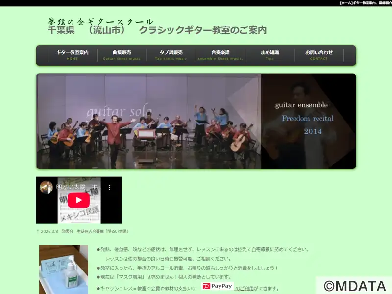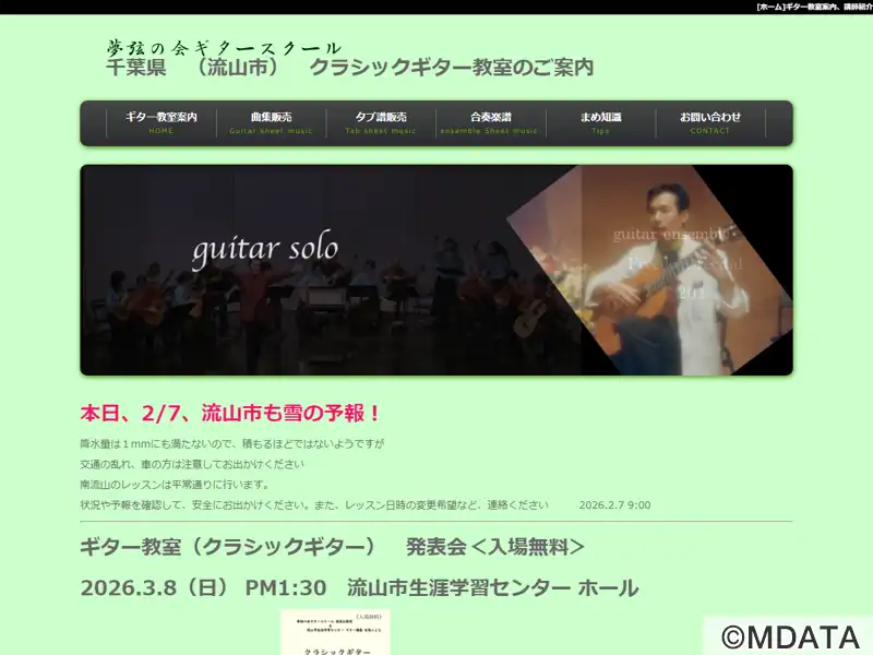 千葉県流山市に1992年開校したクラシックギター教室。個人レッスンを中心に提供している。「楽しく演奏できるようになる」ことを目標に、ひとりのペースに合わせた指導を行なっている。カルチャーセンターでのグループレッスンやアンサンブルも開催し、音楽を通じたコミュニティ形成にも力を入れている。ギターを初めて手にする初心者向けのレッスンもあり。貸しギターも用意している。音楽を通じて「夢」を追求する場を目指す。