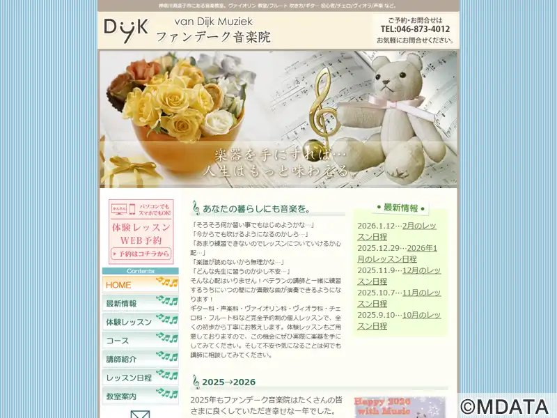 神奈川県逗子市にある音楽教室で、ヴァイオリン、フルート、ギター、チェロ、ヴィオラ、声楽など、多彩な楽器の個人レッスンを提供。ベテランの講師陣による丁寧な指導で、音楽の基礎から応用まで、一人ひとりのペースに合わせて学ぶことができる。音楽を通じて新たな趣味を見つけたい方や、演奏経験がある方のレベルアップまで、個々のスキルレベルに応じたレッスンで、楽しく学ぶことができる。また、レッスン時の楽器貸出もあり。
